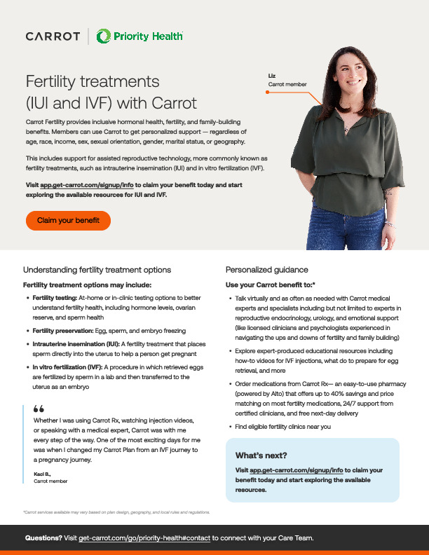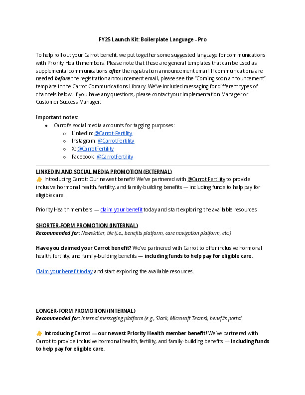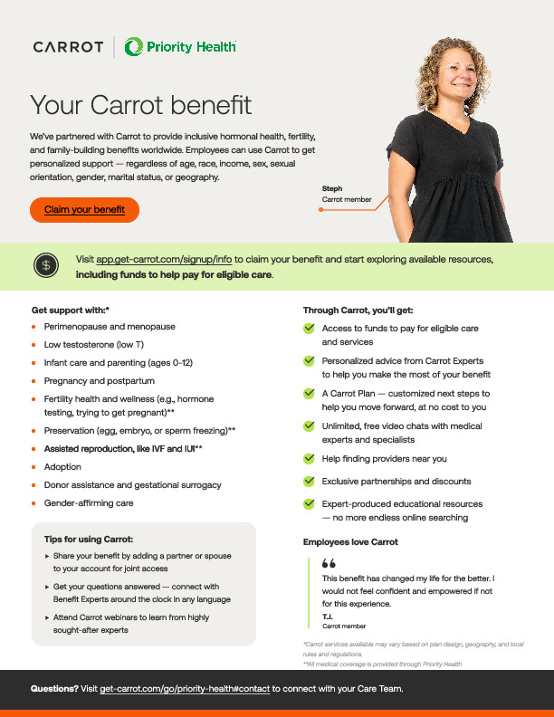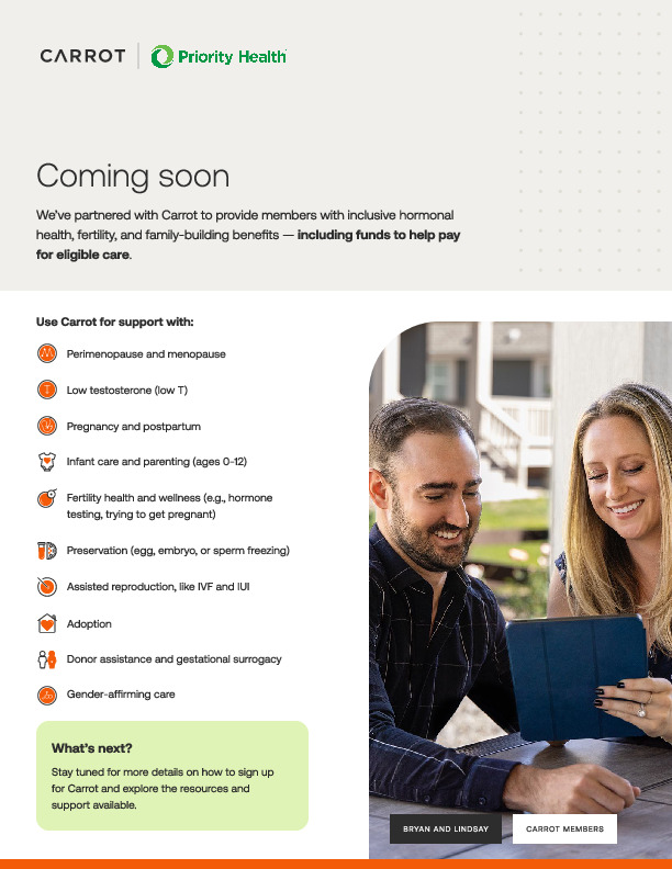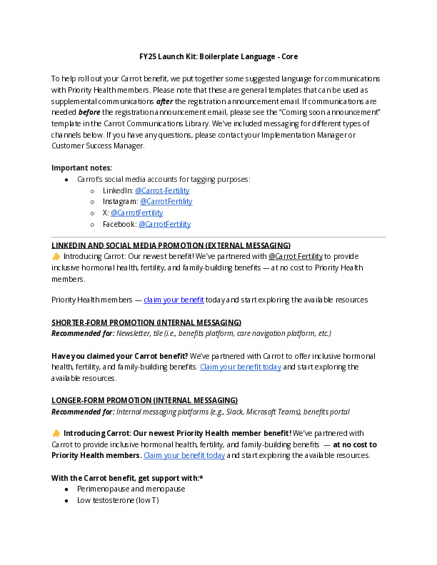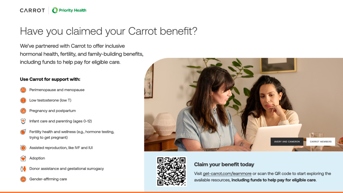 Carrot provides your employees personalized, inclusive, and compassionate care for every stage of hormonal and reproductive health journeys. This tool kit includes program materials for Carrot Core and Carrot Pro programs. Use these materials to promote Carrot to your employees.