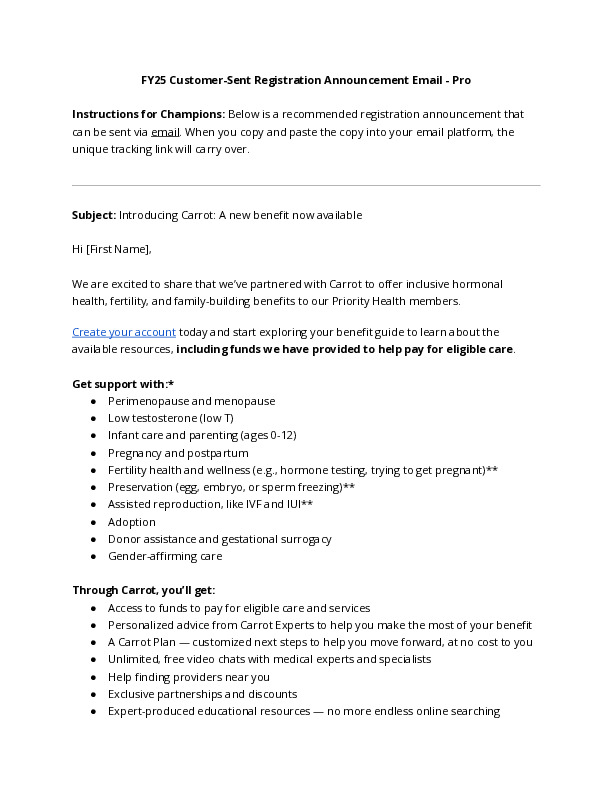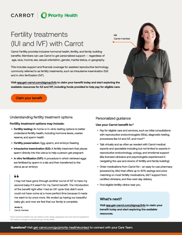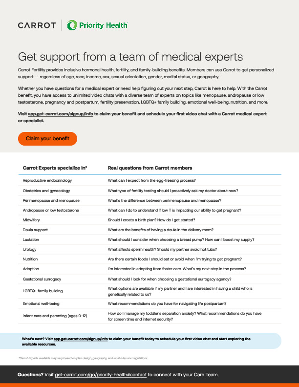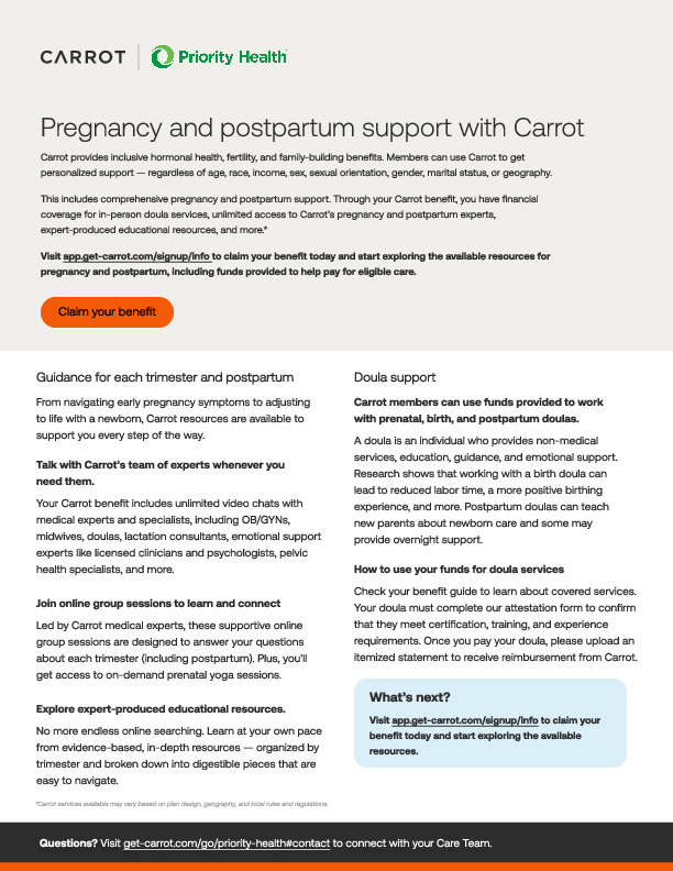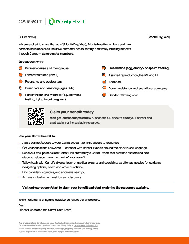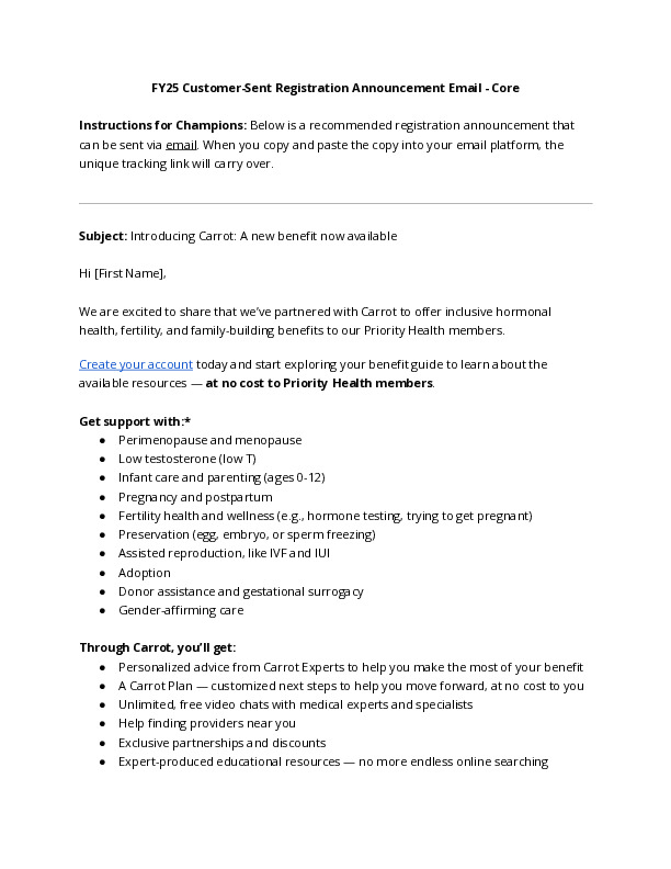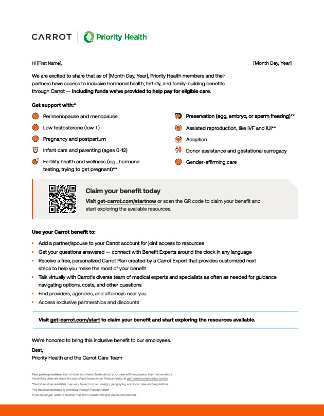 Carrot provides your employees personalized, inclusive, and compassionate care for every stage of hormonal and reproductive health journeys. This tool kit includes program materials for Carrot Core and Carrot Pro programs. Use these materials to promote Carrot to your employees.